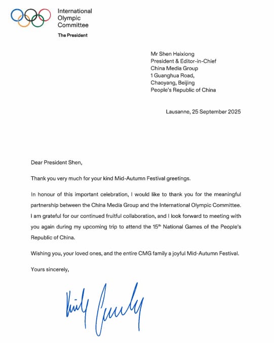 سی ایم جی کے صدر شین ہائی شیونگ کے نام ارسال کردہ خط میں، صدر کووینٹری نے کہا کہ ” اس خوشی کے موقع پر، میں آپ کا شکریہ ادا کرنا چاہتی ہوں! چائنا میڈیا گروپ اور بین الاقوامی اولمپک کمیٹی کے درمیان معنی خیز دوستانہ شراکت داری قابل فخر ہے، اور دونوں فریقوں کے درمیان مسلسل اور ثمر آور تعاون قابل اطمینان ہے۔ میں عوامی جمہوریہ چین کے پندرہویں قومی کھیلوں کے دوران آپ سے دوبارہ ملاقات کی منتظر ہوں۔ میں آپ، آپ کے اہل خانہ، اور سی ایم جی کے تمام ساتھیوں کو وسط خزاں تہوار کی مبارکباد پیش کرتی ہوں، آپ کا خاندان خوشحال ہو!”