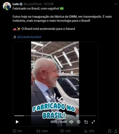 بیجنگ () برازیل کے صدر لُولا نے ساؤ پالو کے ایراکیمابولس میں چین کے گریٹ وال موٹرز کے پلانٹ کی افتتاحی تقریب میں شرکت کی۔ لُولا نے سوشل میڈیا پلیٹ فارم ایکس پر پوسٹ کرتے ہوئے لکھا: “میڈ ان برازیل، فخر! اس کا مطلب ہے کہ برازیل میں مزید صنعتیں، مزید روزگار اور مزید ٹیکنالوجی آئے گی! برازیل مستقبل کی طرف تیزی سے بڑھ رہا ہے!”